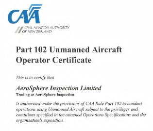 AeroSphere Inspection has been certified to conduct operations under Part 102 of the CAA rules. Big thanks to everyone that was involved in the preparation of the exposition and associated documentation.